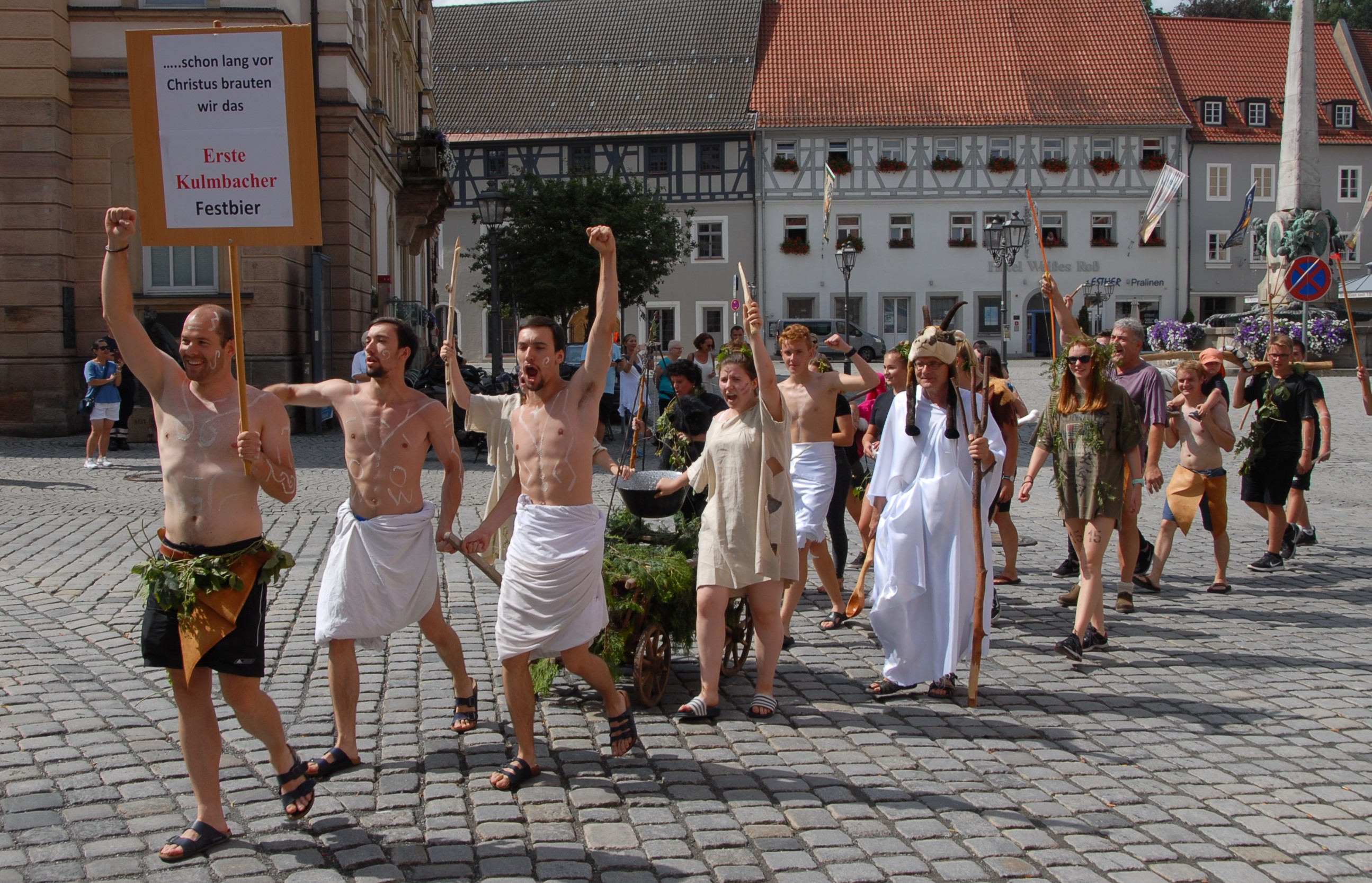 Am Sonntag wurde ebenfalls viel geboten: Fanclubs, Kirchweihgruppen und Stammtische aus Nah und Fern versammelten sich in Kulmbach, um das weltbekannte Bier an seiner Quelle zu genießen. In diesem Jahr erstmals eine Stunde früher, um pünktlich zur Mittagszeit einen Tisch im Stadel zu bekommen und gemeinsam die fränkischen Spezialitäten zu probieren. So ging es also um 11 Uhr vom Brauerei Gelände in der Lichtenfelser Straße einmal quer durch die Stadt in Richtung Festzelt. Über die Pestalozzistraße, den Kressenstein und den Holzmarkt gefolgt von der Klostergasse, führte ihr Weg letztendlich über den Markplatz hin zum Ort des Geschehens. Die aufwendig gestalteten Wagen und kreativen Maskeraden wurden stets von vielen Schaulustigen und begeisterten Zuschauern bewundert und bejubelt.