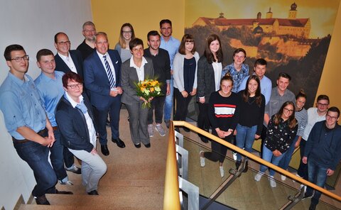 Ein lebendiges Beispiel für eine erfolgreiche Ausbildung in der Kulmbacher Brauerei und mögliche Perspektiven nach der Lehrzeit hatte Kirchner für die Neuankömmlinge parat. Der Personalchef ehrte Ausbildungsleiterin Verena Ramming anlässlich ihres 15-jährigen Betriebsjubiläums. „Heute vor 15 Jahren saß Frau Ramming dort, wo Sie jetzt sitzen. Mit einem guten Ausbildungsabschluss, einer Weiterqualifizierung zur Personalfachkauffrau und nicht zuletzt viel Engagement und Leistungsbereitschaft hat es Frau Ramming an die andere Seite des Tisches geschafft und verantwortet nunmehr seit bald zehn Jahren die Ausbildung, nicht nur bei der Kulmbacher Brauerei, sondern auch bei unseren Tochtergesellschaften“, sagte Kirchner.