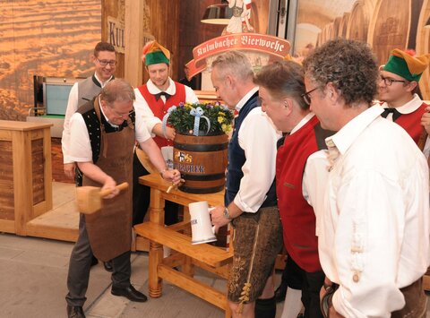 Nach der Verkostung der Festbiere, stand für Henry Schramm eine wichtige Aufgabe bevor: Der Probeanstich. „Auch wenn ich es schon oft gemacht habe, der Anstich eines Bierfasses ist eine verzwickte Sache und man kann es nicht oft genug üben. Der Probeanstich ist da eine schöne Tradition im Vorfeld des Festes“, sagte Schramm lachend und stach das Probe-Fass souverän mit zwei Schlägen an.