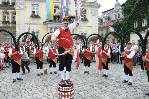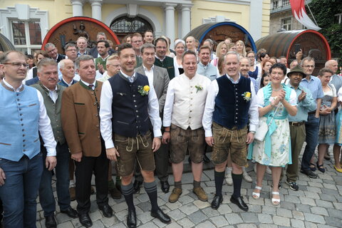 Zum zweiten Mal in der Geschichte der Kulmbacher Bierwoche nahm ein amtierender Bayerischer Ministerpräsident an der offiziellen Eröffnung des Bierfestes teil. Bereits 2018 hatte Dr. Markus Söder es sich nicht nehmen lassen, der Eröffnungszeremonie beizuwohnen. In seiner diesjährigen kurzen Ansprache an das Publikum erklärte Söder auch, warum die Kulmbacher Bierwoche für ihn persönlich eine Herzensangelegenheit ist. „Die Bierwoche ist nicht nur das größte, urigiste Biefest in Franken, sondern in ganz Bayern. In Oberfranken und insbesondere in Kulmbach wird Bier auf „Champions League“-Niveau gebraut. Mir persönlich schmeckt Bier und deshalb bin ich auch gerne hier in Kulmbach“, ergänzte der Ministerpräsidenten gut gelaunt. Christian Bernreiter, Staatsminister für Wohnen, Bau und Verkehr nickte zustimmend und verzichtete, diesen lobenden Worten noch etwas hinzuzufügen. Das Publikum und alle Ehrengäste erfreuten sich darauf dem Tanz der Büttner, welche musikalisch durch die Kulmbacher Stadtkapelle begleitet wurden. Der zum Abschluss abgefeuerte Salutschuss der Kgl. Priv. Schützengilde Kulmbach gab das Zeichen, zum Festzugaufmarsch Richtung Stadl.