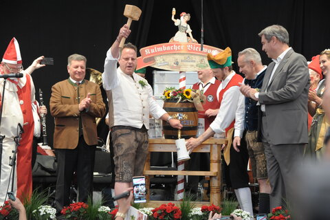 Dieser Aufforderung kam Ingo Lehmann insofern gerne nach, in dem er zunächst, der Tradition folgend, ein Gedicht zur Bierwoche vortrug, welches mit Charme und Witz gespickt war und zum Abschluss mit großem Applaus der Stadlbesucher quittiert wurde. Doch dann griff er zum Anstichhammer, legte den Hahn routiniert an die Buchse an und schlug einmal kräftig zu. Drin war der Hahn und das Festbier konnte in die Krüge fließen.