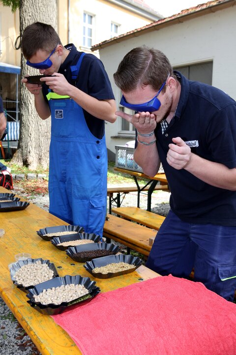 Zum Schluss durften Lars und Johannes ihre sensorischen Fähigkeiten unter Beweis stellen. Mit verbundenen Augen sollten sie Werkzeuge ertasten und Rohstoffe entweder mit dem Geruchs- oder Geschmackssinn erkennen. Die Aufgabe endete in einem äußerst knappen Kopf-an-Kopf-Rennen, welches Lars schließlich für sich entschied.