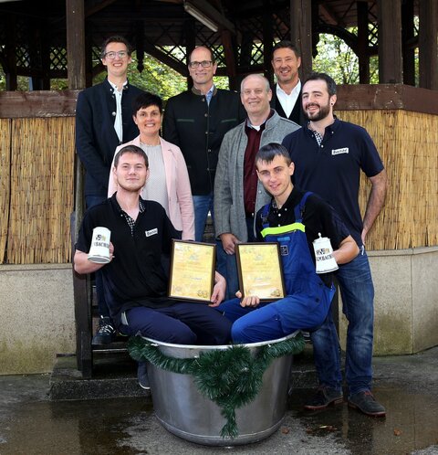 Nach den Spielen stellten die beiden Auszubildenden ihre jeweils selbst kreierten Gesellensude vor, die sie unter dem wachsamen Auge von Dipl.-Braumeister Sebastian Hacker in der Gläsernen Lehr- und Versuchsbrauerei des Bayerischen Brauereimuseums im Kulmbacher Mönchshof gebraut hatten.
