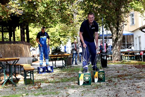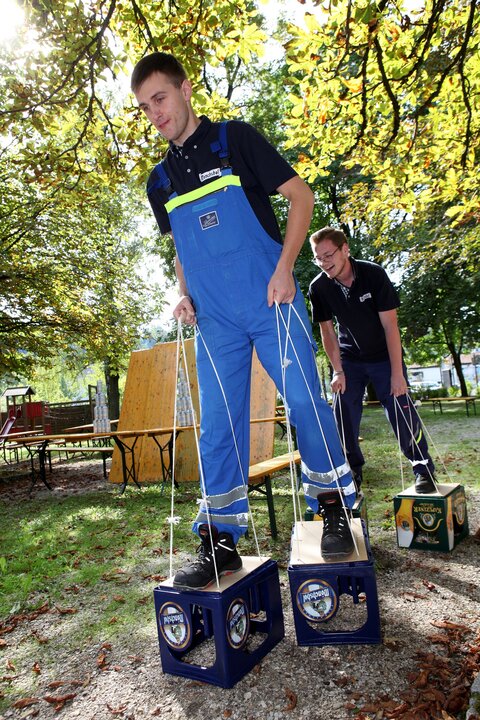 Die erste Aufgabe galt dem Aufwärmen. So einfach die Regeln beim Maßkrug-Stemmen auch sind, so schwer können die 2,5 Kilo, die ein voller Maßkrug wiegt, auch werden. Beide Nachwuchsbrauer machten lange Zeit eine richtig gute Figur. Doch Johannes erwies etwas mehr Ausdauer und entschied das erste Spiel für sich.